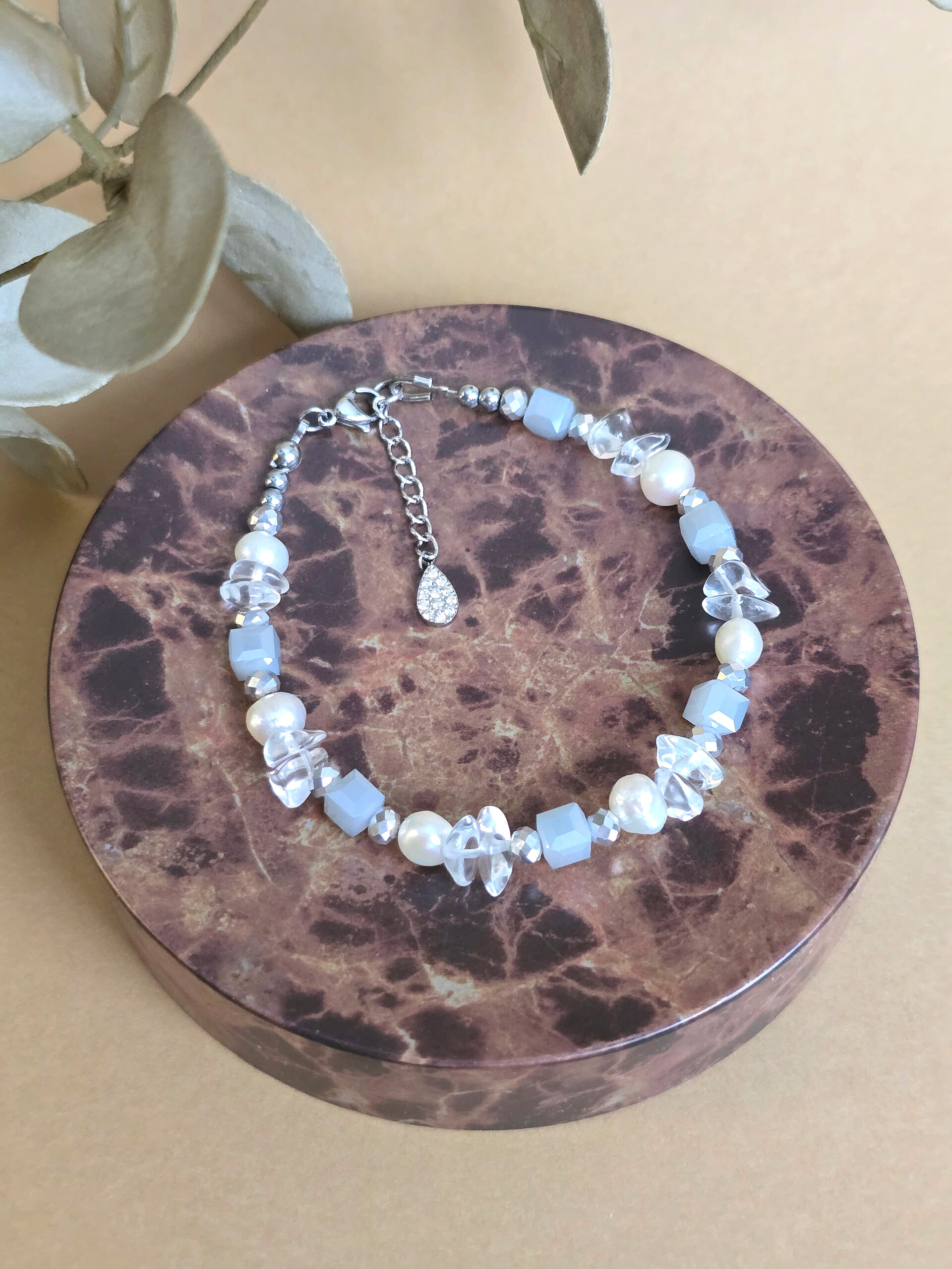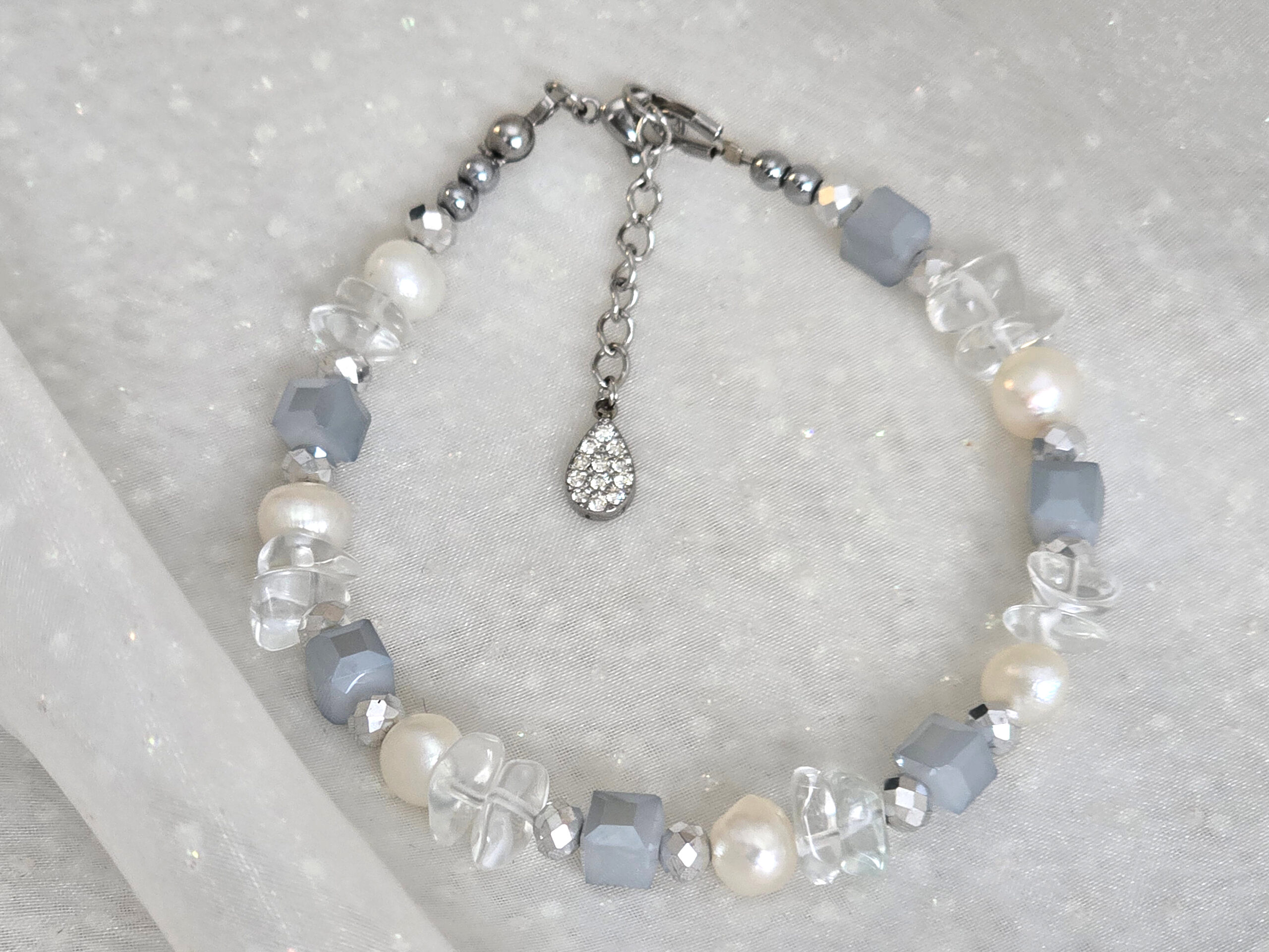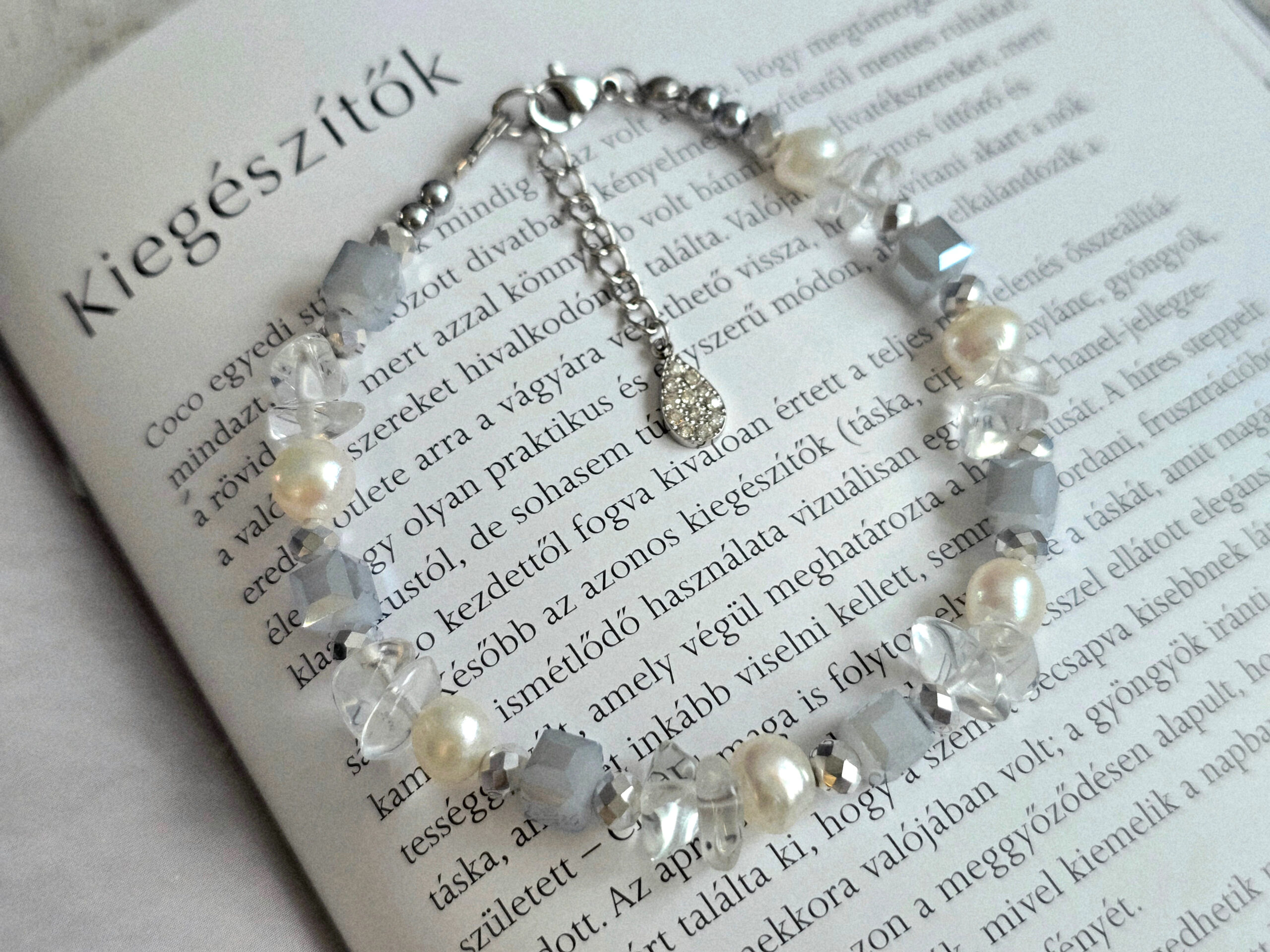 A karkötő alapját a szabálytalan formájú, barokk tenyésztett gyöngyök adják, melyek minden fényviszonyban más arcukat mutatják. A tisztaságot jelképező hegyikristály ásványok és a sejtelmes kékes és ezüst cseh kristálygyöngyök modern, mégis időtlen keretet adnak a kompozíciónak. Az ékszer dinamikáját az apró, fémes fényű hematit ásványok teszik teljessé.