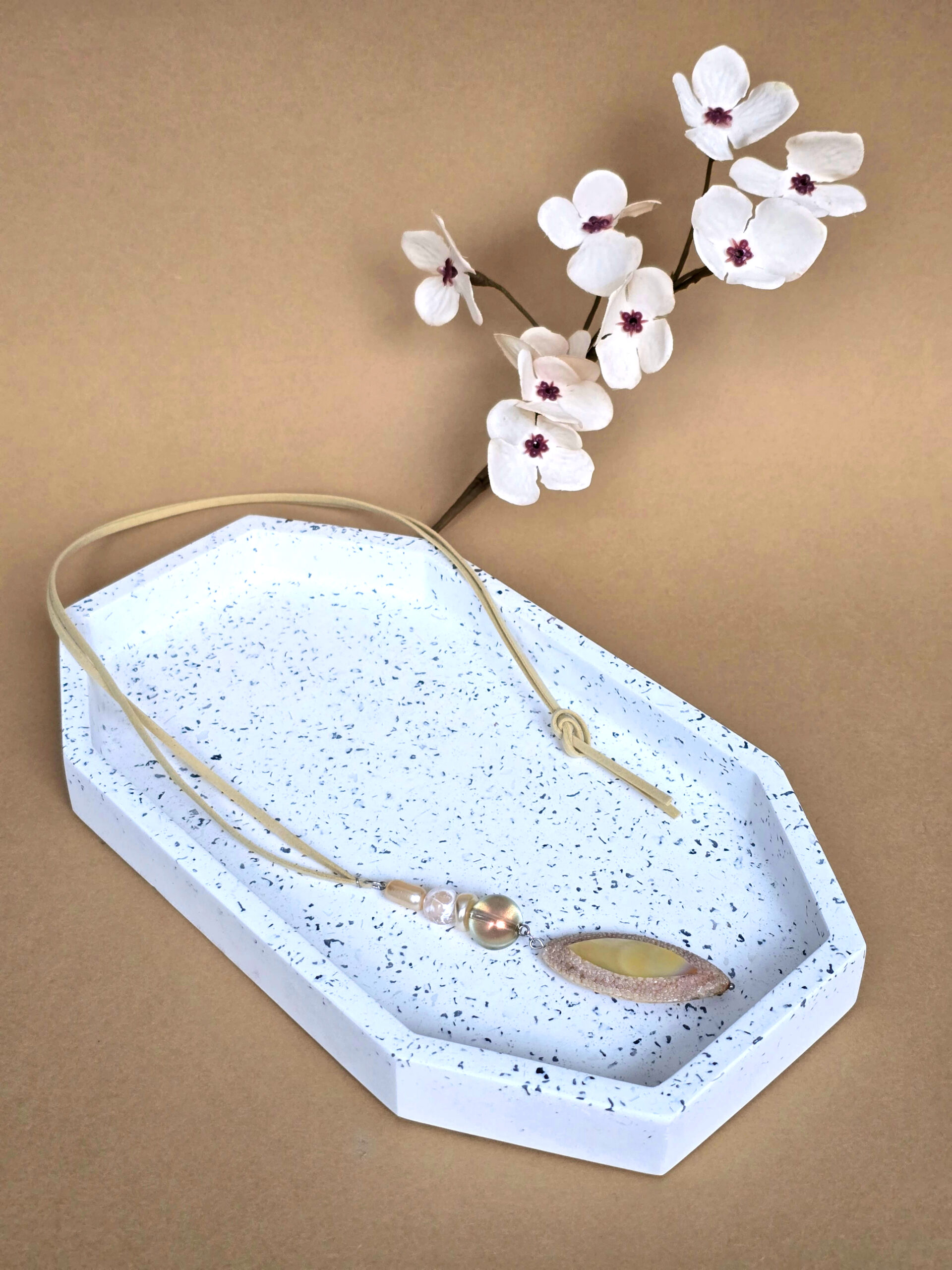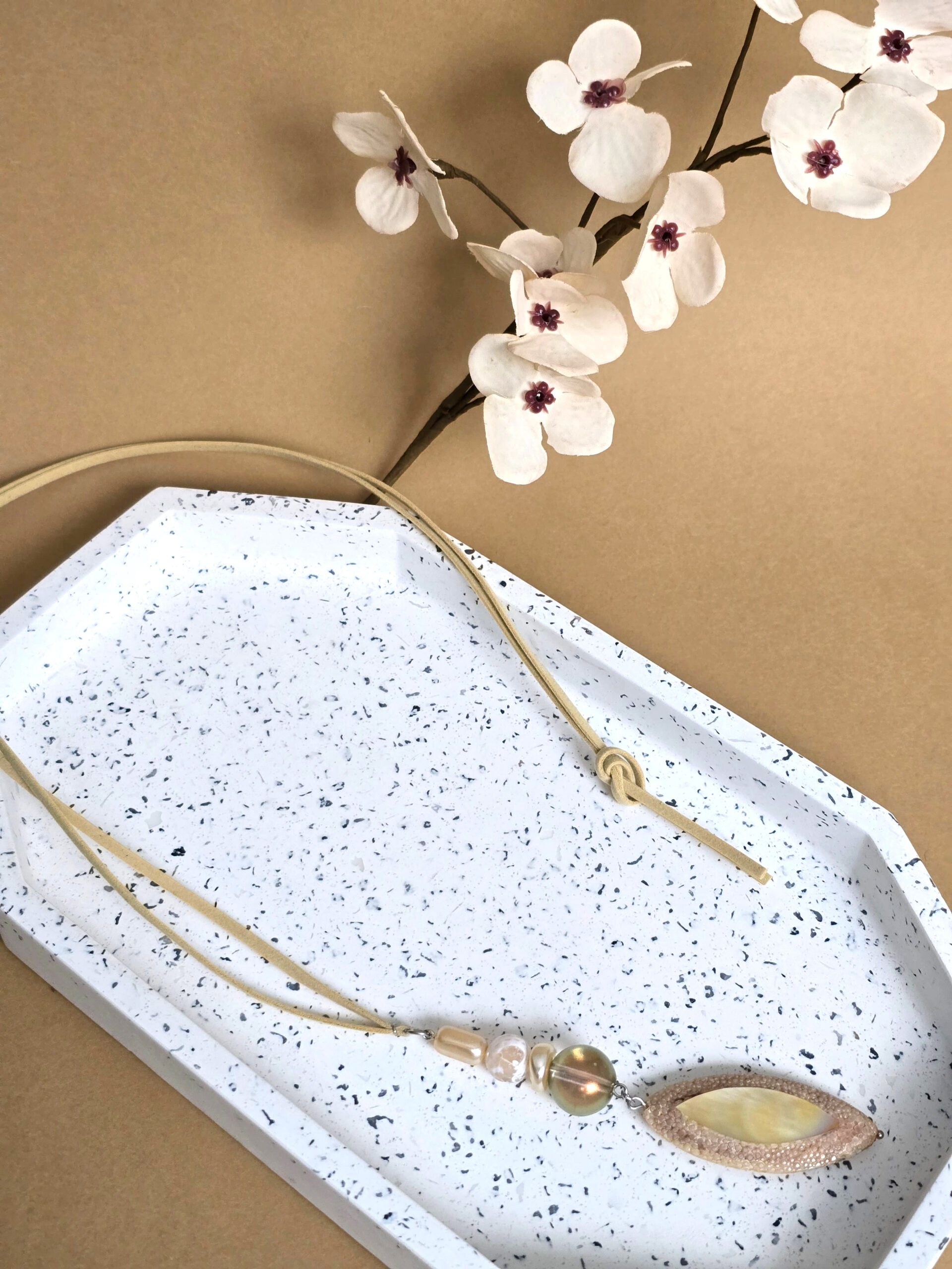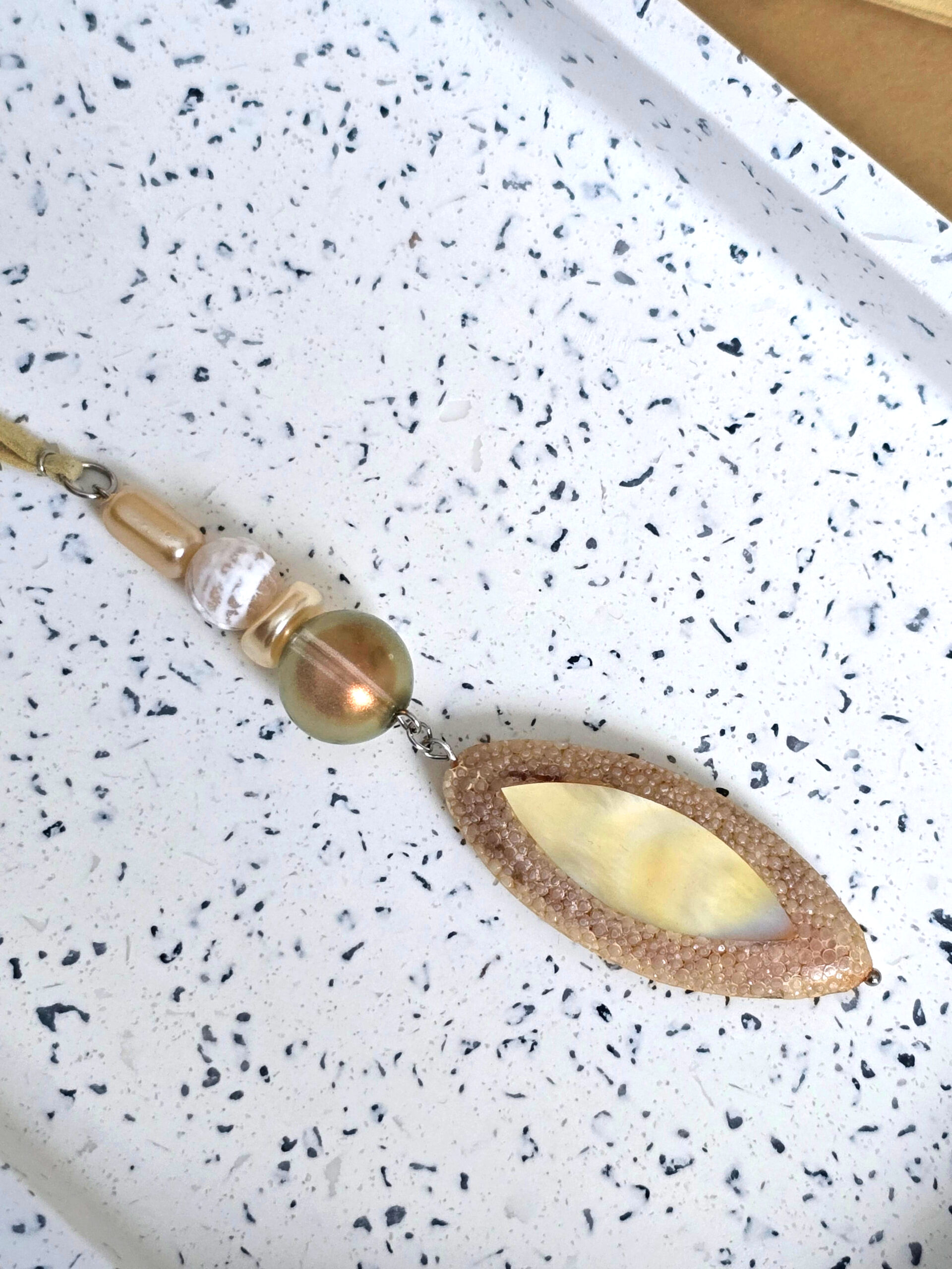 Earth & Shell Harmony – Hosszú bőr nyaklánc kagylóberakásos medállal