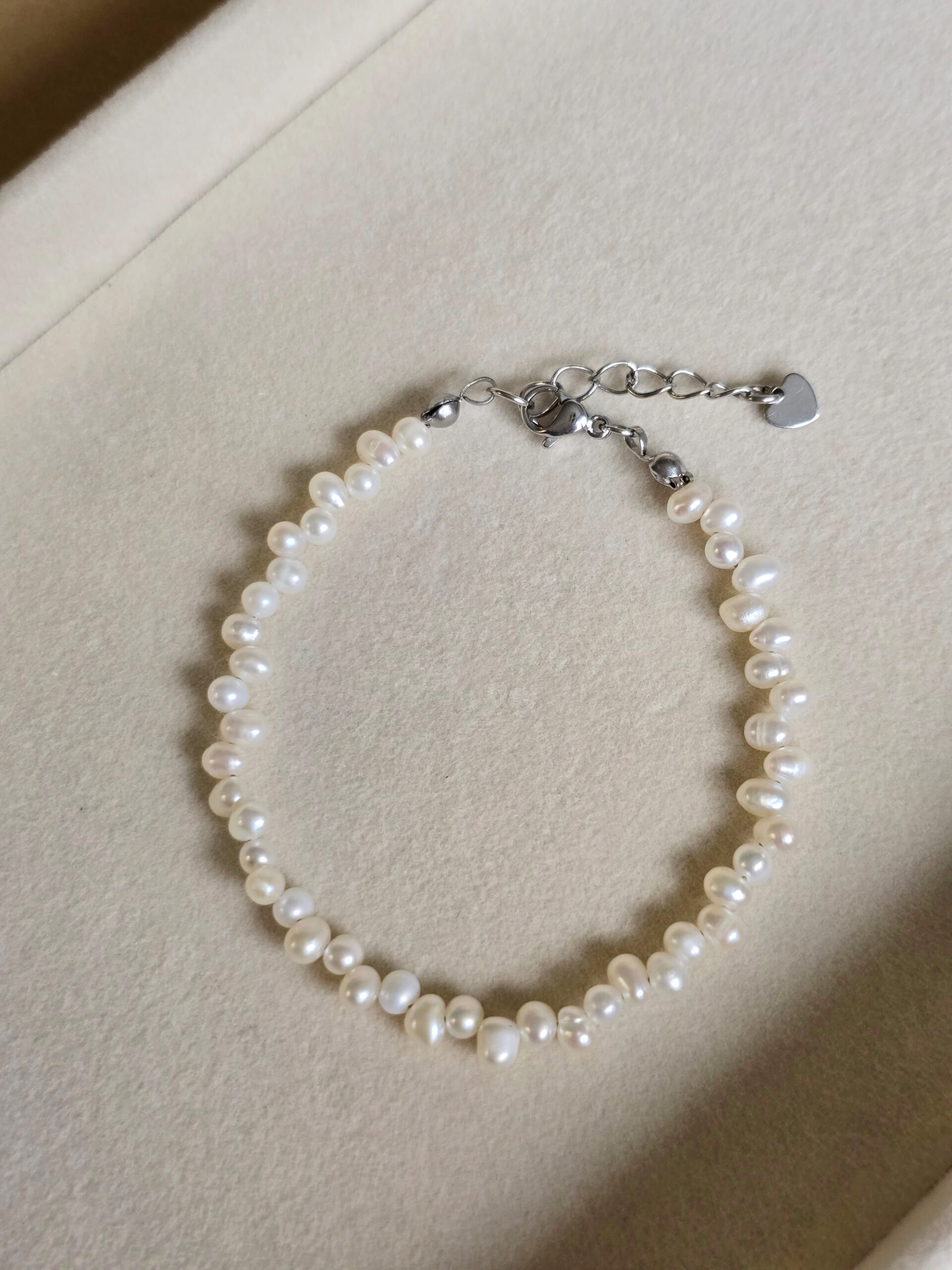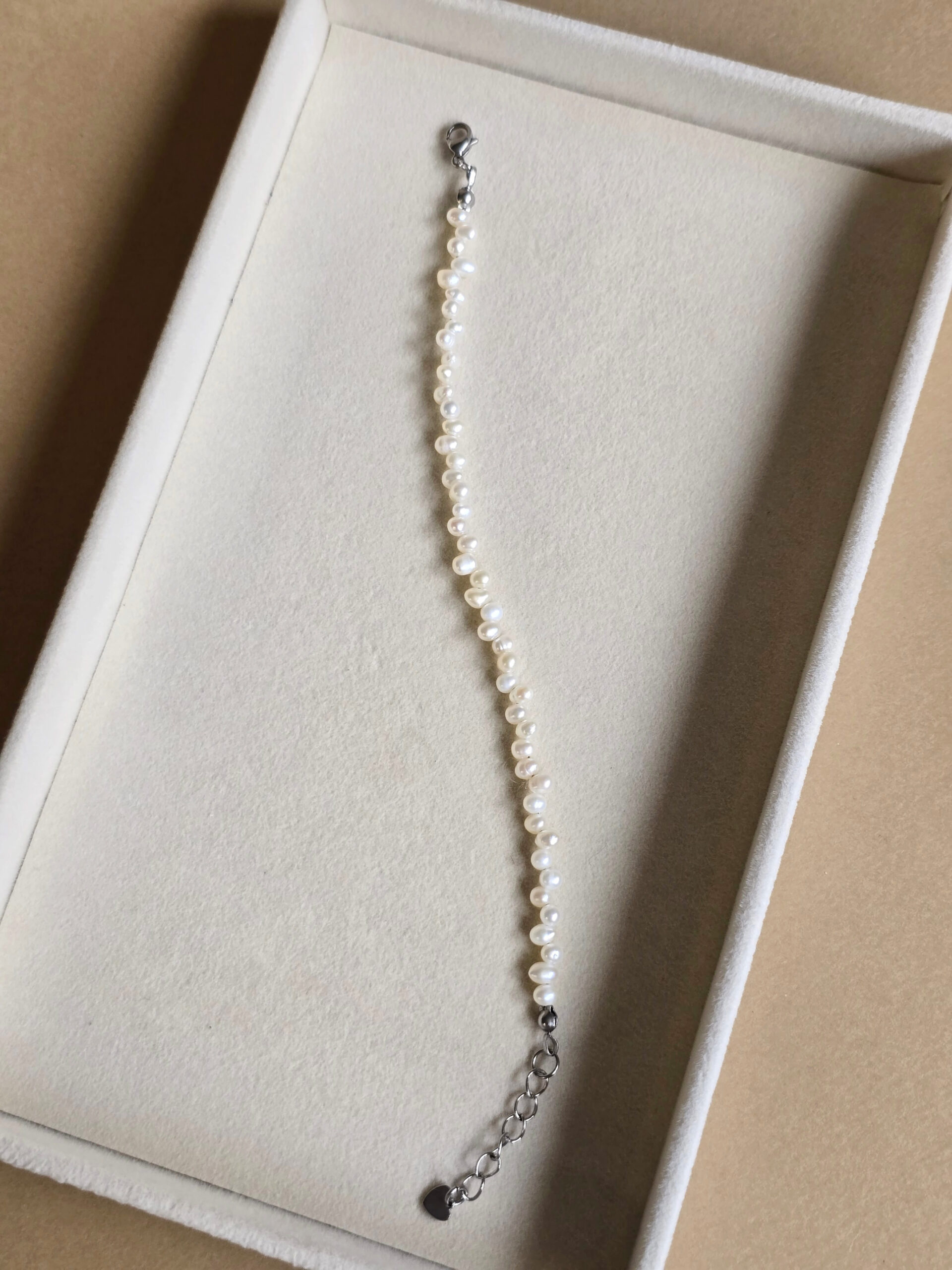 A karkötő alapját apró, 3-3,5 mm-es rizs alakú tenyésztett gyöngyök adják. Ami igazán egyedivé teszi, az a fúrási technika: a szemek nem hosszantian, hanem keresztben vannak átfúrva, így egy izgalmas, texturált felületet hoznak létre, ami gyönyörűen játszik a fénnyel.