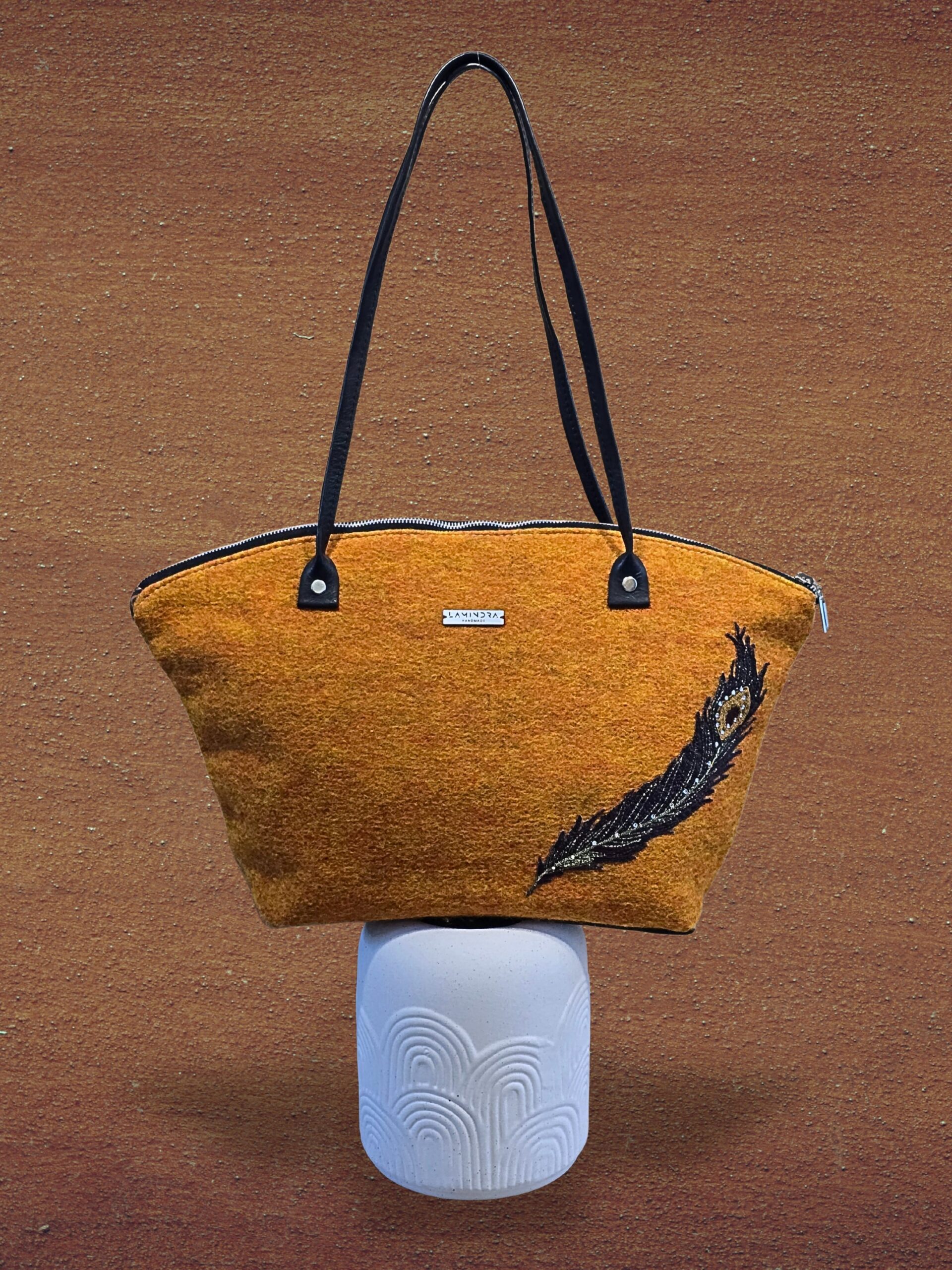 • Egyedi dizájn: A gazdag, mustársárga gyapjúfilc anyagot egy finoman kidolgozott pávatoll motívum díszíti, amely elegáns és művészi megjelenést kölcsönöz neki.