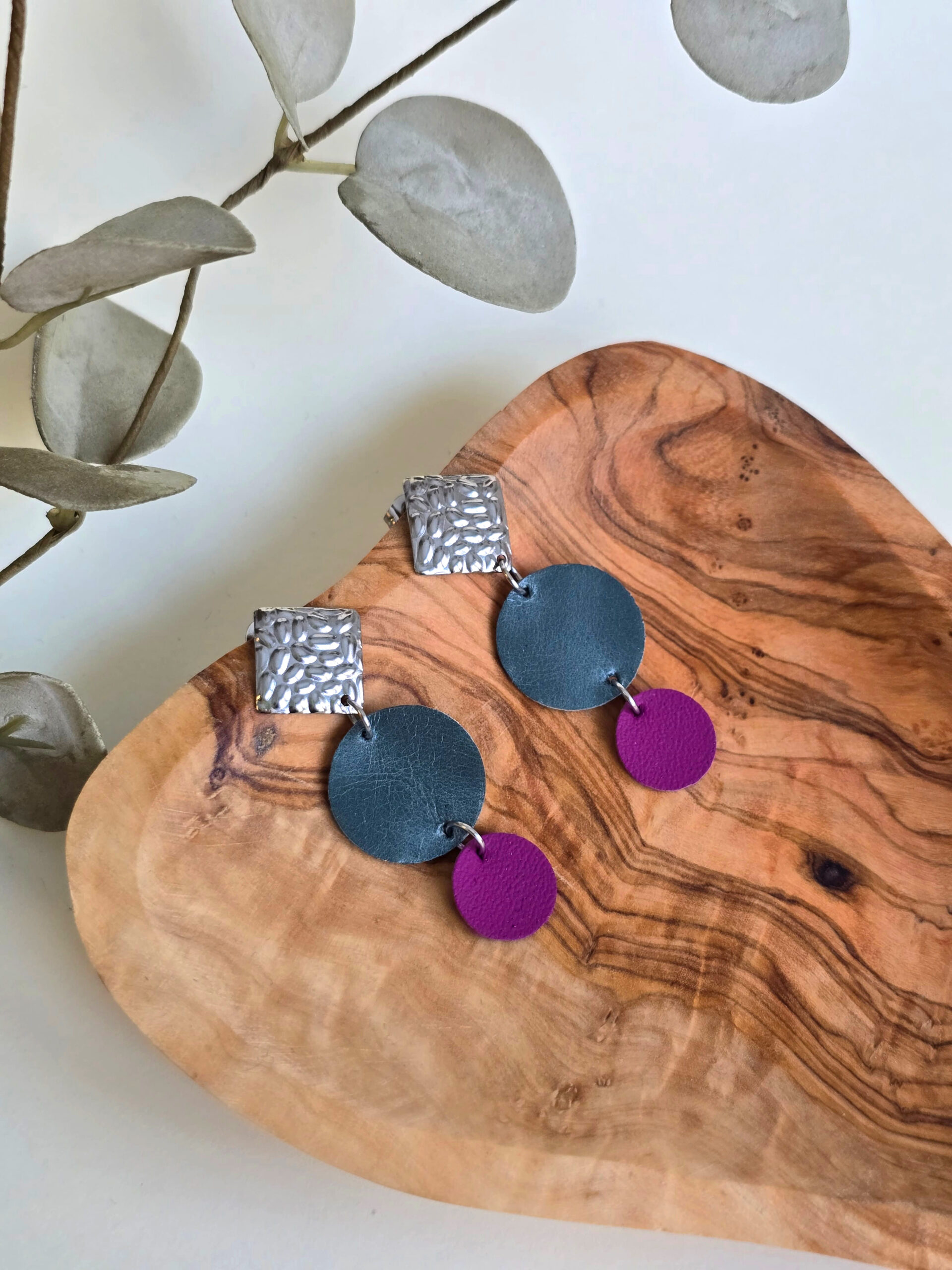 Ez a fülbevaló a mélytürkiz és a lila bőr találkozása egy kalapált mintás nemesacél alappal. Modern, geometrikus és elképesztően könnyű, így észre sem veszed, hogy viseled – ellentétben a környezeteddel, akik biztosan megdicsérik majd!