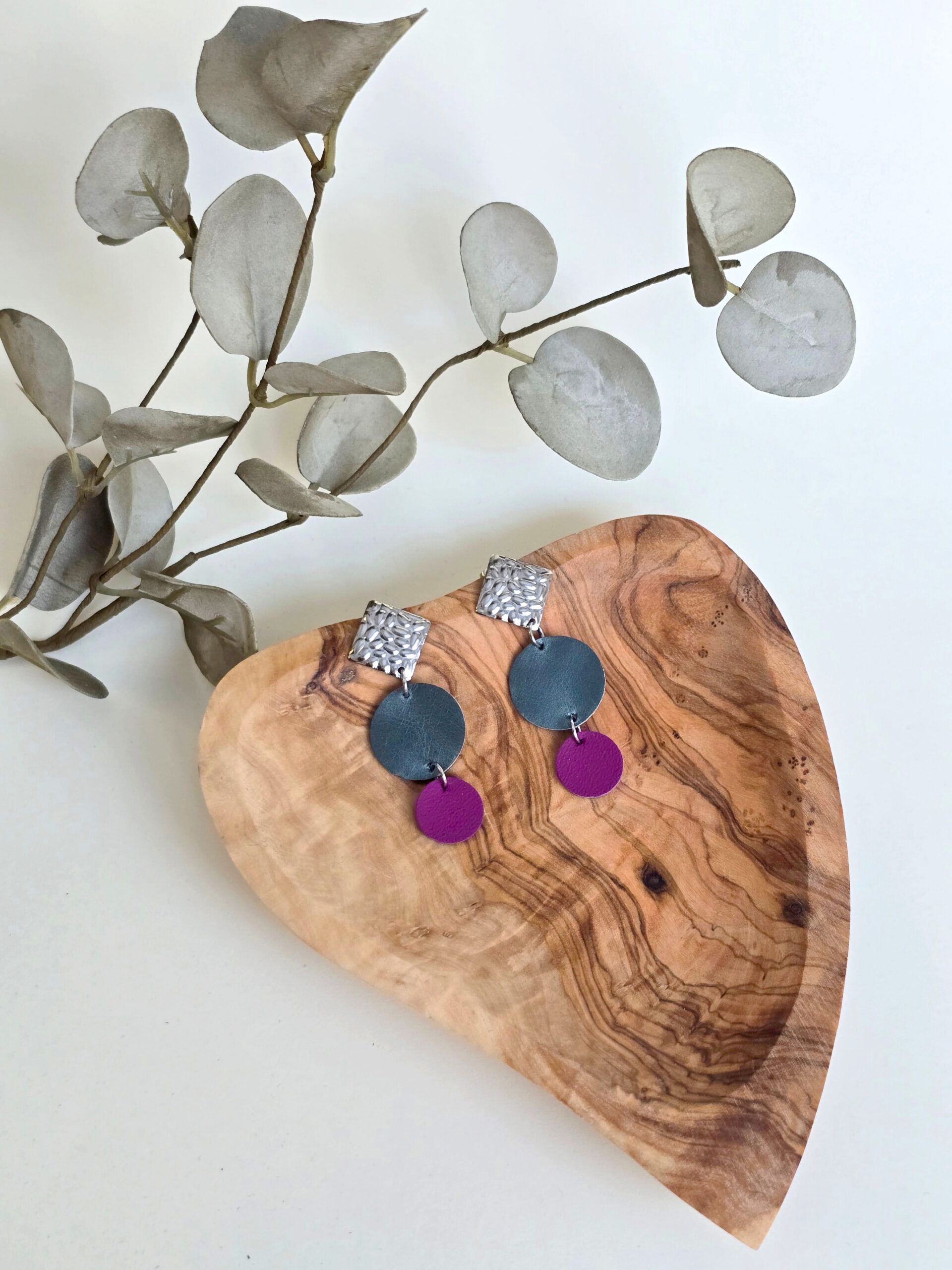 A LAMINDRA HANDMADE műhelyében ezúttal a mélytürkiz és a vibráló lila találkozott egy modern, geometrikus formavilágban. Ez a fülbevaló azoknak készült, akik szeretik a statement darabokat, de fontos számukra a kényelem és a természetes anyagok használata.